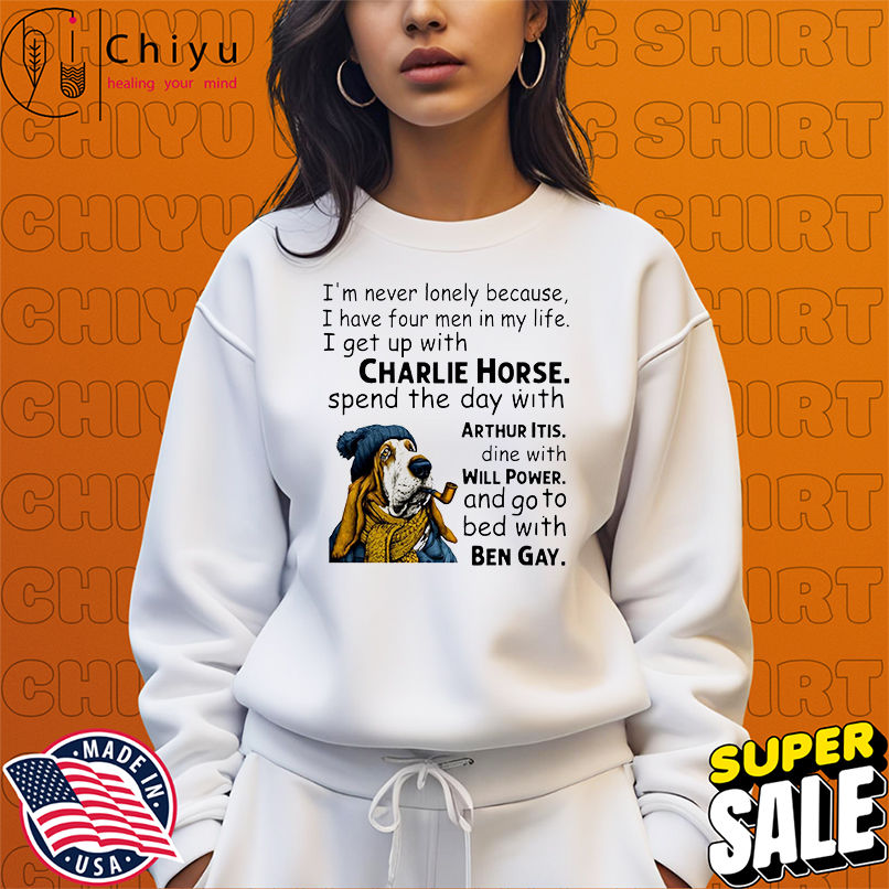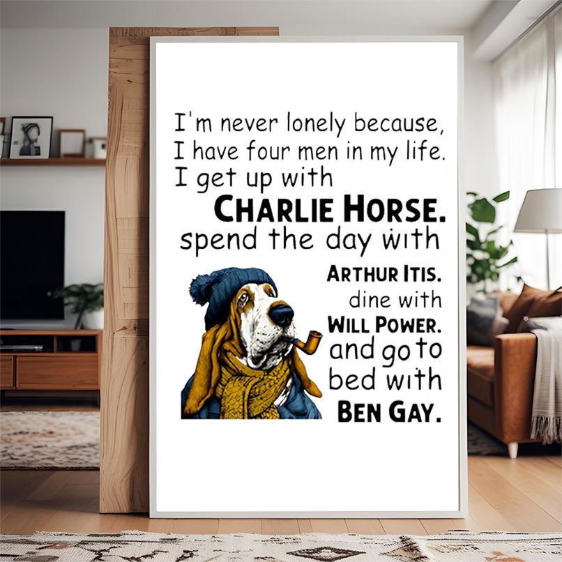 This item: Dog I'm never lonely because i have four men in my life i get up with charlie horse spend the day with arthur dine with itis shirt, Hoodie, Sweatshirt, Poster Canvas, Mug, Ornaments Original price was: $29.97.Current price is: $19.97. SAVE 33% Original price was: $29.97.Current price is: $19.97. SAVE 33%